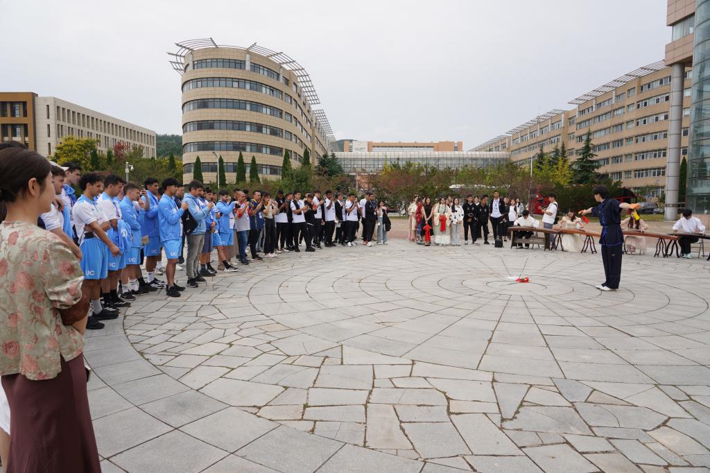在大学生活动中心广场上,我校师生与代表团共同欣赏了由校团委师生精心编排的武术、古筝、舞蹈等文艺演出,身着汉服、旗袍等中华传统服饰的志愿者为远道而来的国际友人送上寓意团结与吉祥的中国结。在欢悦融洽的气氛中,双方合影留念,记录这段跨越山海的友谊。