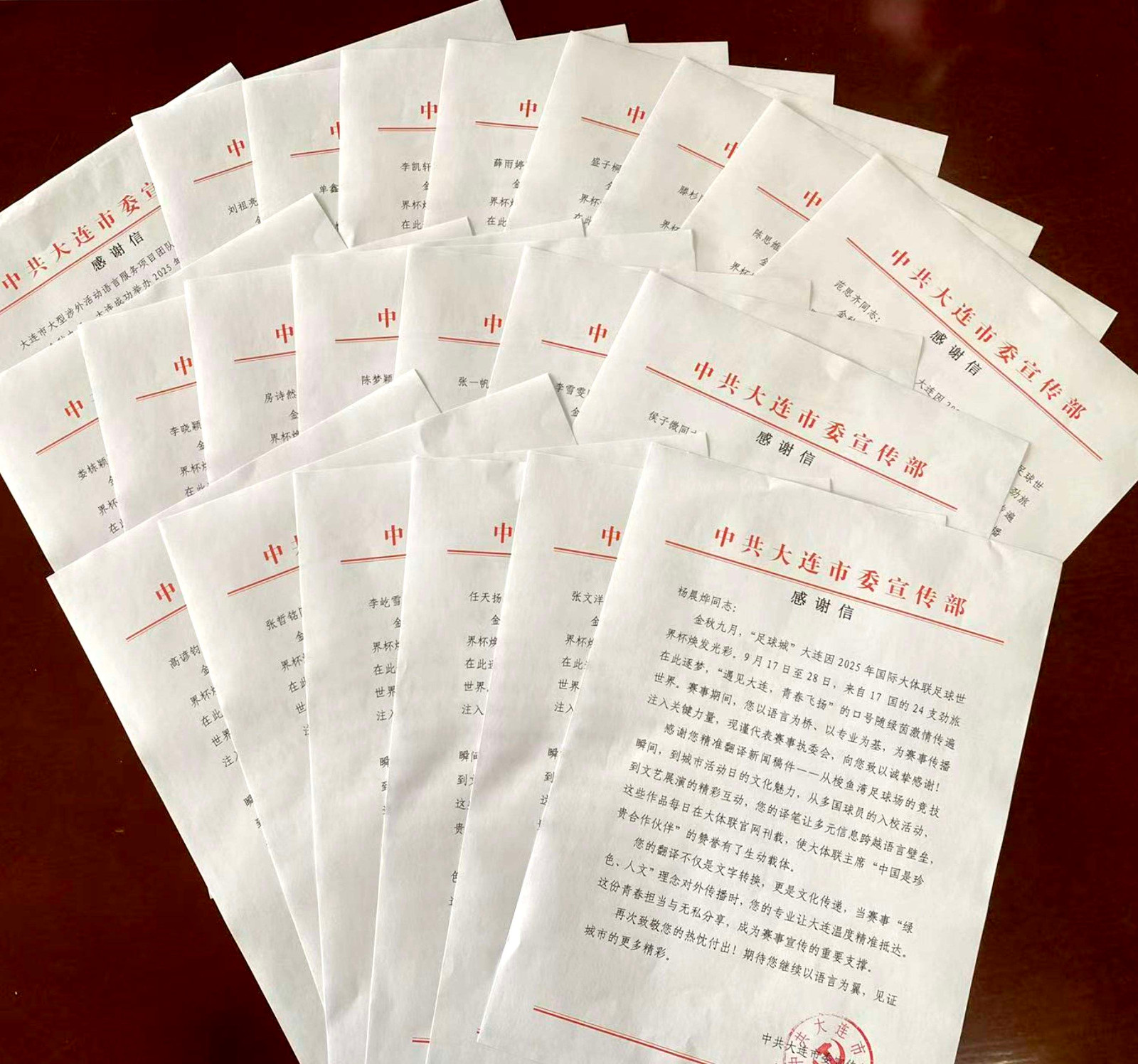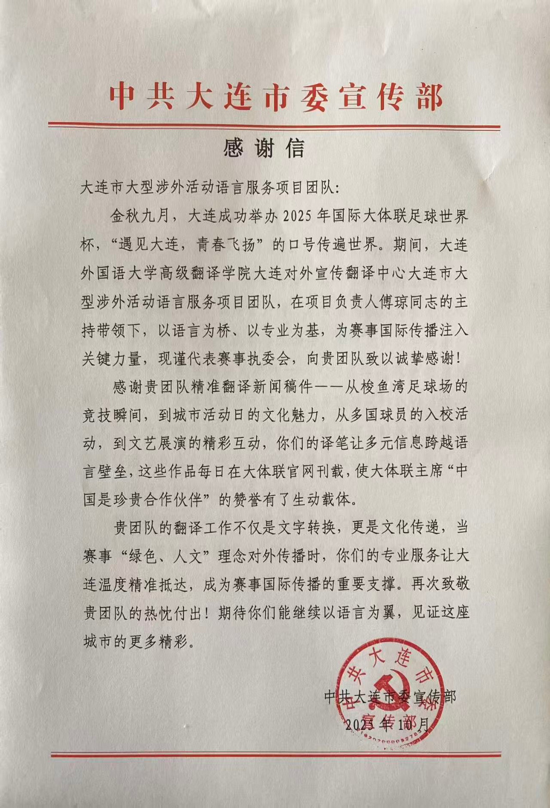 近日,中共大连市委宣传部向我校高级翻译学院发来感谢信,感谢“大连市大型涉外活动语言服务项目”团队在2025年国际大体联足球世界杯中的专业表现。赛事期间,在傅琼老师牵头的项目组教师团队的指导下,刘祖亮、单鑫、李凯轩、薛雨婷、盛子桐等21名同学高质量完成赛事新闻翻译与对外信息发布工作,获主办方与社会各界一致好评。