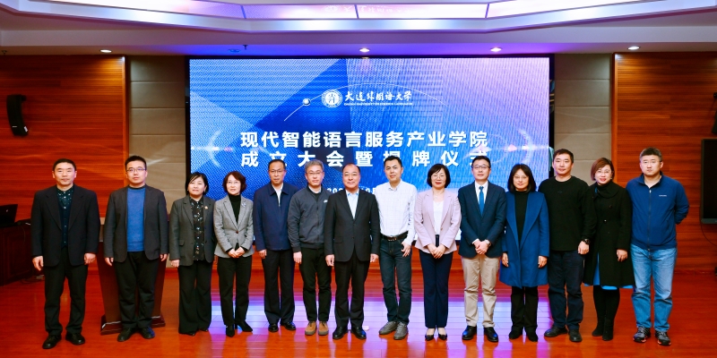在全体与会者的见证下,丛明才校长与杨东副主任、赵睿阳经理、现代智能语言服务产业学院院长邹德艳共同为“大连外国语大学现代智能语言服务产业学院”揭牌。