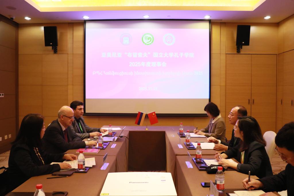 11月15日上午,世界中文大会期间,2025年度亚美尼亚“布留索夫”国立大学孔子学院理事会议于北京国家会议中心召开。“布留索夫”国立大学校长、孔子学院亚方理事长大卫·久尔金扬(David Gyurjinyan),我校校长、孔子学院中方理事长丛明才,孔子学院中外方院长、孔子学院工作办公室相关负责人共同参会。
