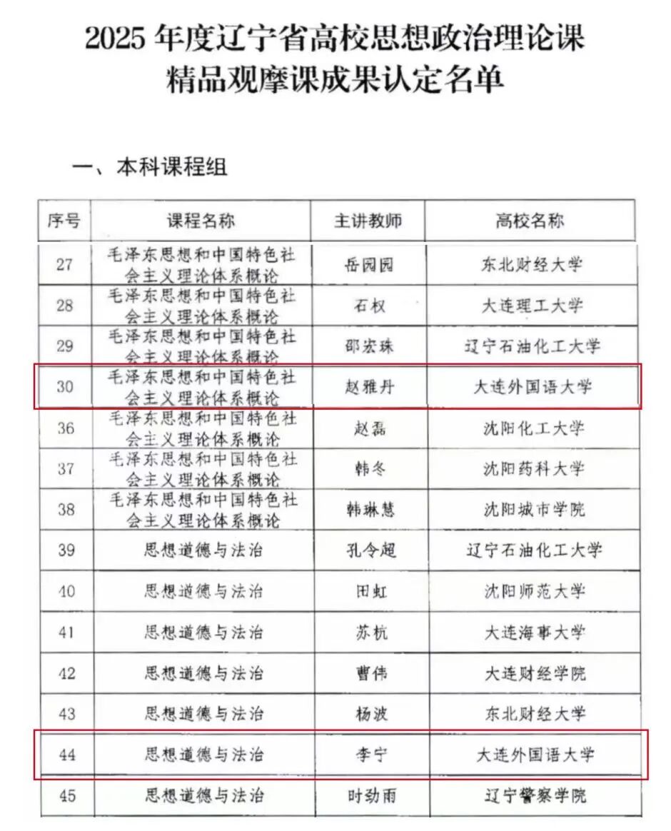 近日,辽宁省教育厅公布了2025年度辽宁省高校思想政治理论课精品观摩课成果认定结果,我校马克思主义学院李宁、赵雅丹两位教师主讲的课程,凭借前沿的教学理念和扎实的教学功底成功获评为省级精品观摩课,是我校持续深化思政课教学改革的又一重要成果。