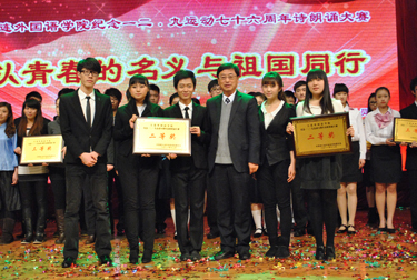 团委书记张皎介绍完到场的领导和嘉宾后,随即比赛在学生会社团部的话剧《永远的一二•九》中拉开帷幕。随后,各个院系代表队依次上台进行比赛。由国际艺术学院带来的《手足同盟》诗朗诵优美与激昂并存,一句句激情澎湃,饱含爱国热情的动人语句在钢琴、小提琴以及小合唱的现场伴奏下娓娓道来,触动人心;在韩国语系带来的诗朗诵《我骄傲,我是东方的希望》中,同学们在朗诵的同时,现场展示书法,获得了在场观众的阵阵掌声;俄语系带来的《中国有了不起的青年》以及法语系带来的《华夏礼赞》,朗诵中穿插了小剧场式的表演,同学们慷慨激昂地陈述着自己的爱国热情,引发了台下观众的强烈共鸣,博得了在场师生的热烈掌声和欢呼声;随后,由经济与管理学院带来的诗朗诵《奋斗!为这传世不朽的荣光》更是将本次比赛推向了一个小高潮,他们在朗诵中不仅介绍了近代中国的发展历程,灾难与国殇、进步与成果,更鲜明地表达了对祖国的热爱、对侵略者的痛恨、对同胞的关怀以及对未来的希冀,慷慨激昂的演讲使得台下的掌声一浪高过一浪。 接下来,由文化传播学院带来的《永传不熄的火种》以人生中的少儿篇、青年篇、老年篇的片段形式回顾了中国发展的历史进程,不论是悠扬的钢琴伴奏,抑或是优美的伴舞,都使得节目显现着温情与感动;由德语系带来的朗诵《少年中国说》将梁启超的著名文章与当代大学生热爱祖国、奋发图强的志向相结合,讲述了当代年轻人的重要性,激励同学们要树立“大任担当,唯我栋梁”“民族复兴,壮我华邦”的宏伟志向;日本语学院带来的《历史不会忘记》则为同学敲响警钟,提醒同学时刻铭记历史,以史为鉴,高喊“来者可追,铸我中华锦绣前程”的豪情壮志,在同学们铿锵有力的演讲中带给观众以心灵上的震撼与感动,获得了在场观众的一次又一次的热烈掌声。 研究生部的《纪念一二•九,青春献祖国》、英语学院的《威武中国,纪念一二•九》以及应用英语学院的《青春中国》都表现了当代青年人的爱国主义意志和爱国热情,展现了当代大学生爱国爱校的良好精神风貌。本次比赛在软件学院带来的《永不磨灭的记忆,碧血的丰碑》中圆满落下帷幕。 最终,经济与管理学院摘得本次比赛的桂冠,韩国语系以及国际艺术学院荣获二等奖,三等奖由日本语学院、英语学院以及文化传播学院获得,而应用英语学院、法语系、软件学院、俄语系、德语系、研究生部六个院系获得了包括最佳创意奖、最佳人气奖、最佳组织奖、最佳团队奖、最佳表演奖、最佳风采奖六个奖项。学校领导为获奖院系代表颁奖并合影留念。 本次比赛的成功举办,不仅激发了同学们的爱国热情,继承和发扬了爱国主义精神,树立为报效和振兴中华民族而努力学习的远大志向,更提高了我校学生的综合素质,培养了高尚的道德品质,有利于增强我校学子热爱祖国的崇高精神,促进了校园文化的繁荣与发展。(姚嵩)