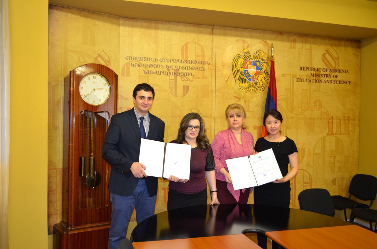 1月16日,埃里温“布留索夫”国立语言与社会科学大学孔子学中方院长杨美华和外方院长Gor在教育部会议大厅接受了亚教育科学部正式颁发的《< 亚美尼亚初级汉语教学大纲>批准令》和《亚美尼亚中小学汉语教学许可证书》。