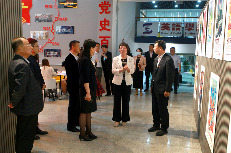 报告会后,建设银行一行对学校党史长廊、VR实训中心、智慧教室、虚拟情景口笔译实训中心、图书馆、学校沙盘进行了实地参观走访,了解学校大数据平台、教学信息化等情况。在参观走访中,校长刘宏重点介绍了学校的发展历程、学科专业设置、国际化办学成果、人才培养等情况。