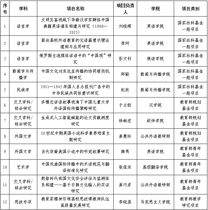 此次立项项目呈现出多学科协同并进的良好态势。优势学科表现稳健,外国语言文学学科延续了一贯的高水平科研产出;与此同时,非外语学科及交叉学科研究项目数量有所提升,学科结构更趋均衡,为培育新的学术增长点奠定了坚实基础。项目类型丰富多元,既有聚焦理论前沿的一般项目(规划基金项目),也有立足实践创新的青年基金项目,还包括关注思政课教师队伍建设的专项课题。这些项目紧密围绕国家战略需求与社会发展热点,兼具学术深度与现实意义,凸显了科研工作服务国家发展大局的价值导向。