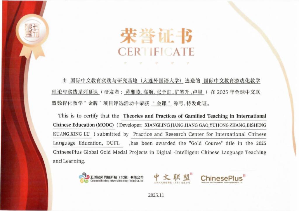 本次评选活动中,我校国际中文教育实践与研究基地的基地项目成果之一,“国际中文教育游戏化教学”慕课在评选中脱颖而出,获评“金课”称号。该慕课由我校国际中文教育专职教师蒋湘陵、高航、张予虹等共同研发,依托多年深耕国际中文教学的实践积淀,团队以 “游戏化教学” 为核心切入点,创新性构建 “理论—方法—实践” 三层递进式慕课体系。课程内容兼具系统性与实用性,既涵盖游戏化教学概览、语音教学、听说教学等核心模块,也囊括汉字教学、阅读教学等关键环节,全面覆盖国际中文教学的核心场景。