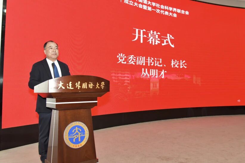1月13日上午,大连外国语大学社会科学界联合会(以下简称“校社科联”)成立大会暨第一次代表大会在学校图书馆报告厅举行。辽宁省社会科学界联合会党组成员、副主席杨波,辽宁省社会科学界联合会二级巡视员周兆明,辽宁省社会科学界联合会学会部崔嵬巍,大连市社会科学界联合会党组成员、科研部部长李建国,我校党委书记王伟辰,校长丛明才,党委副书记苏健,副校长刘风光、赵勇,党委常委张皎、李辉、杨慧出席大会。全校各职能部门、二级学院、科研机构负责人及社会科学工作者参加本次会议。