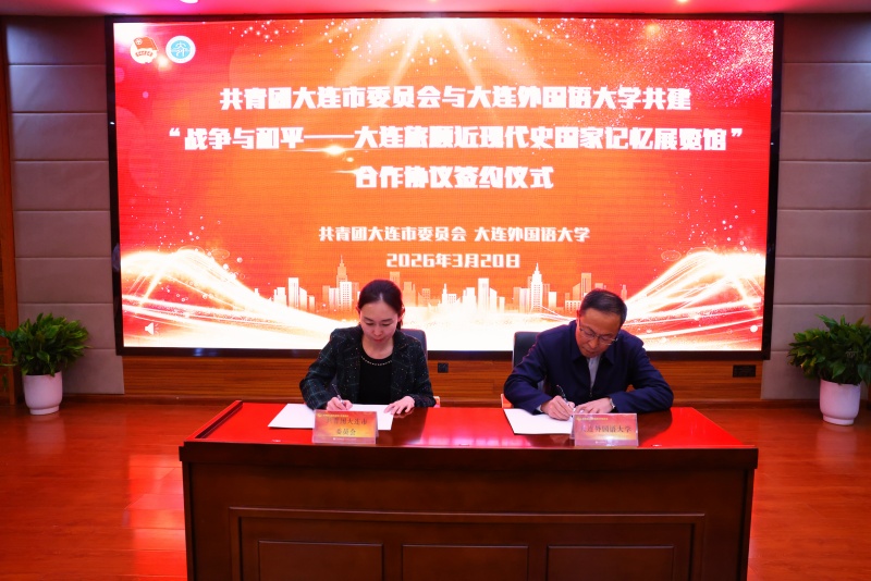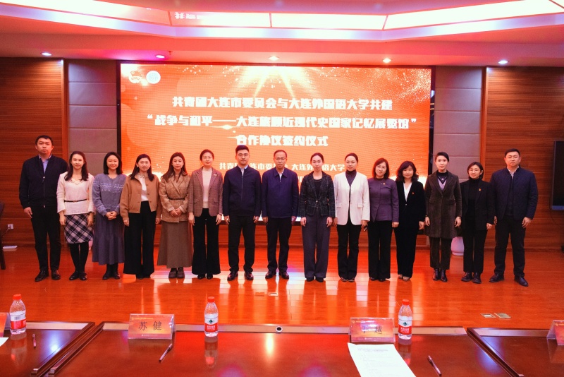 3月20日下午,共青团大连市委员会与大连外国语大学共建“战争与和平—大连旅顺近现代史国家记忆展览馆”合作协议签约仪式在我校承志楼601举行。团市委副书记于越、刘鑫,我校党委副书记苏健出席活动,双方有关部门负责人及我校各学院团委书记、部分思政教师参会。