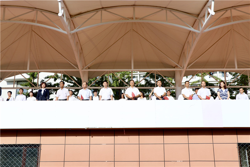 英姿飒爽的国旗班成员迈着矫健的步伐护送着五星红旗进入场地。伴随着庄严的《中华人民共和国国歌》,五星红旗冉冉升起,迎风飘扬。全体师生行注目礼,齐唱国歌,深情表达对祖国无限的热爱和崇高的敬意。