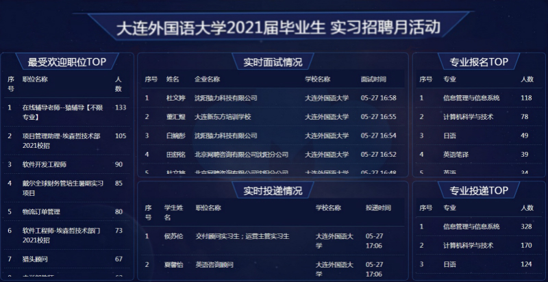 5月27日,学校举办2021届毕业生实习就业视频双选会。本次视频双选会是首届实习招聘月活动之一,使用全新改版的“大外学生就业云平台”线上向用人单位精准推介毕业生,为毕业生和用人单位搭建了便捷高效的交流平台。