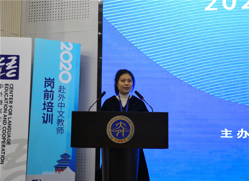 典礼开始,来自中国政法大学的俞可文作为教师代表发言。她表示这是她第二次来大外参加培训。三天的培训虽然短暂,但让大家更加清醒地认识到在特殊时期肩负在中文教师肩上的责任。她提到,中文教师做的事情不是空中楼阁,而是脚踏实地的深耕。中国在坚定地沿着自己的道路飞速前进时,也不忘让别的国家搭上中国发展的便车,我们构建命运共同体,谋求共同发展。作为中文教师,我们要做的就是教好“中国话”,讲好“中国故事”,告诉世界中国的此时此刻在发生什么,让中国的声音被世界听到。