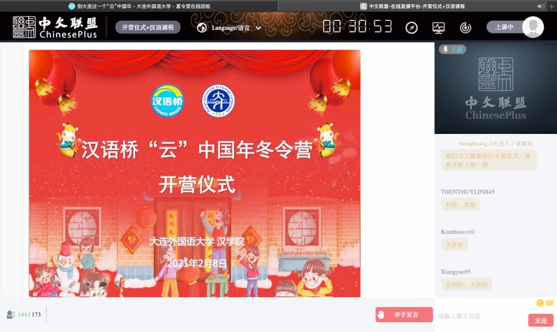 2月8日,由教育部中外语言交流合作中心主办,我校汉语国际推广基地与汉学院共同承办的汉语桥“云”中国年线上冬令营正式开营。来自日本、越南、巴西、泰国、俄罗斯等17个国家的537名学员相聚在网络云端,共襄此次开营仪式,并将在接下来的一周时间里与中国人一道,共同度过传统中国年。我校校长刘宏及相关部门负责人参加了开营仪式。
