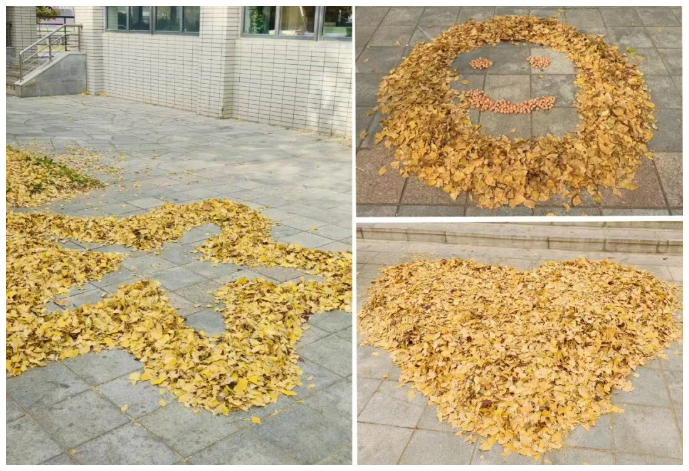 近日,大连外国语大学校园里的“银杏伞”在社交平台上火了。谁懂?本来赶着去上课却在前往教室的路上被“银杏伞”惊艳得移不开眼。星星、笑脸、爱心……路面上随处可见由银杏叶堆成的图案。有人惊喜地发现“银杏伞”下的桌椅上也都粘满了银杏叶,旁边还放着一只毛绒玩偶网友直呼:“这场景也太唯美了!” 而创造这些别致手工作品的正是大连外国语大学校园里的保洁阿姨们。有网友认为:这些暖心的作品背后藏着阿姨们对生活的热爱小编对此表示同意!