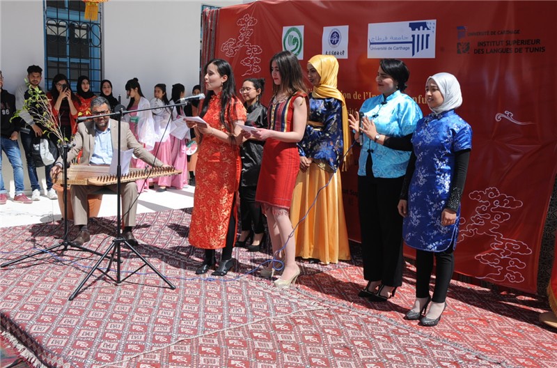 本学の劉宏学長は挨拶の中で、両国の方々がカルタゴ大学孔子学院の設立に尽力貢献してくれたことに感謝した。学長は、チュニジアはユーラシアとアフリカとの海運線において、なくてはならない地中海の要地に位置しており、悠久の文明と多文化の融合の地であり、チュニジア初の孔院が異なる文明の融合に貢献をしていくことを望んでいる。孔子学院の設立はチュニジアでの中国語教育の発展と文化交流を促進するものだろうと述べた。カルタゴ大学のベンヌダー学長は発言の中で、カルタゴ大学孔子学院の設立に貢献した双方の方々に感謝し、チュニジア初の孔子学院として、困難を克服し、中国との教育協力と文化交流のためにさらに努力したいと述べた。除幕式では、チュニジア高等言語学院の中国語学科の学生代表が中国の民謡「ジャスミン」とチュニジアの民謡「ジャスミンの下の夜」を歌い、中国の伝統舞踊を披露し、中国の現代詩を朗読した。学生たちの流暢な中国語とすばらしい演技は現場から大きな拍手を浴びた。
